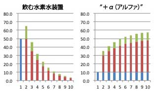 累積水素量を比較したグラフでも判るように、 “+α(アルファ)” は圧倒的な残留水素量を誇ります。